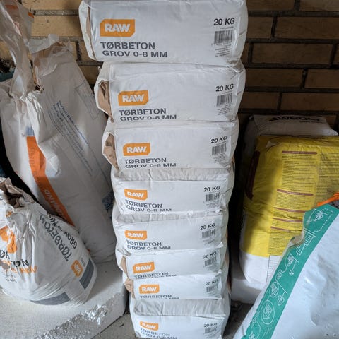 Jeg har 15 sække a 25 kg i overskud fra et hegnsprojekt i november. Alle sække er uåbnede og har ligget tørt vinteren over. Det er super nemt at arbejde med til f.eks. sætning af hegnsstolper.