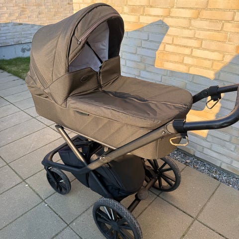 Medfølger: madras, kopholder, barnevognssele, baby dyne med betræk, et lagen, solsejl, myggenet, regnslag, to aftagelige tasker under barnevognen - den forreste driller i lynlåsen.