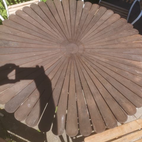 Marguerit havebord i træ og metal. Bordpladen er udført i trælameller lagt i et radiært mønster med cirkulær midte. Stellet er i metal med fire slanke ben. Velegnet som udendørs bord på terrasse, altan eller i haven. Bordet giver plads til flere siddende omkring den runde bordplade.det et margueritbord med teaktræ lameller et flot bord