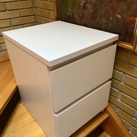 Hvid lille kommode eller sengebord med 2 letløbende skuffer.