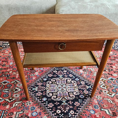Fint lille bord med bordplade af teaktræ, der er en skuffe og hylde under.