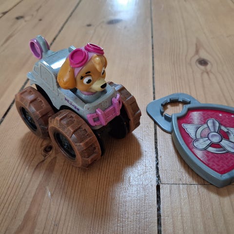 Paw Patrol Skye med hjul. Kan skubbes tilbage og køre under stativet, så kan man prøve at ramme skiltet.