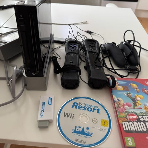 Nintendo Wii konsol med tilhørende tilbehør. Sættet omfatter Wii-konsol, to Wii-fjernbetjeninger, forskellige plasttilbehør til sportsspil (bl.a. ketcher, bat og rat), kabler samt en spil-disk med æske vist på billederne. Konsollen er egnet til brug med bevægelsesbaserede spil og familie- eller partyspil, afhængigt af hvilke spil der anvendes. Alle viste dele indgår i sættet efter sælgers oplysning. kom med et bud