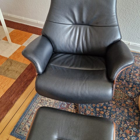 Eksklusiv Aviora hvilestol i sort sorrento læder med elektrisk indbygget fodskammel, der giver ekstra komfort og afslapning.
