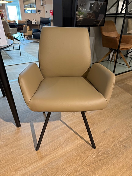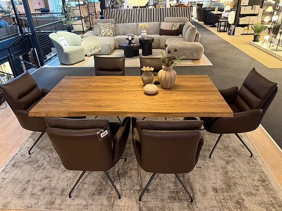 Stolen har en elegant base i valnød samt en stabil swiel-fod i sort aluminium, som giver fleksibel bevægelse og et moderne udtryk.
