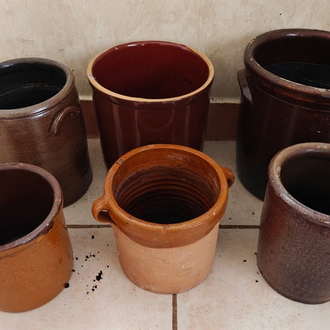 krukker sæt i brun keramik. Sættet består af tre krukker i forskellige størrelser med glaseret overflade. Velegnet til opbevaring eller som urtepotter indendørs eller udendørs, afhængigt af behov og placering. 1stk 4liter og 2 stk 5 liter 35 kr pr stk