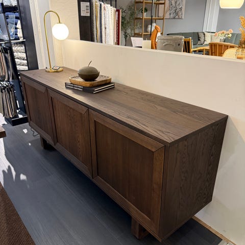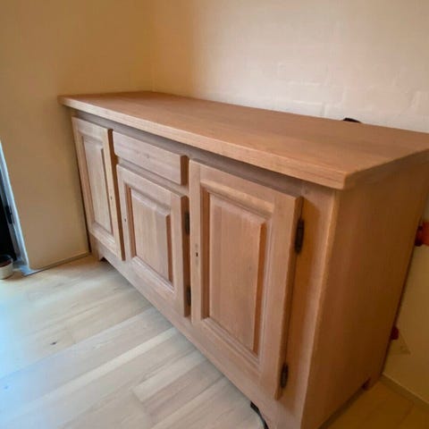 Skænken er lavet i fineret eg med massiv top plade, skuffefronter og massivt egestel.