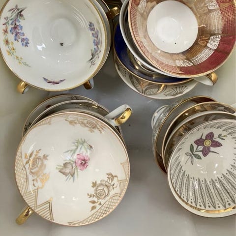 Runde porcelærskåle med håndmalet blomsterdekoration og gennembrudt metalrand. Skålene har lyse, glatte indersider med forskellige blomster motiver i flere farver. Undersiden er glat, hvor nogle af skålene har filtpuder monteret. Egnede som små serveringsskåle, dekorationsskåle eller til opbevaring af småting i hjemmet.