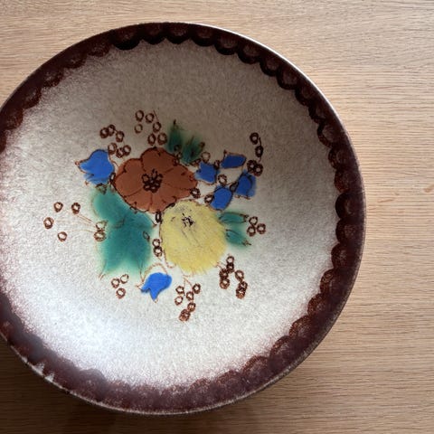 Runde porcelærskåle med blomsterdekoration og metalrand