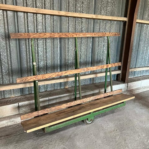 Tørrebord med 2x21 rækker gule arme monteret på grøn metalramme. Højde 174 cm, Bredde 100 cm, Længde 100 cm.Stativet står på fire drejelige hjul, hvilket gør det nemt at flytte rundt. Egnet til opbevaring eller tørring af emner, f.eks. plader, rammer eller andre genstande, der kan placeres på de vandrette arme. Konstruktionen er i metal og er beregnet til brug i værksted, lager eller lignende miljøer.