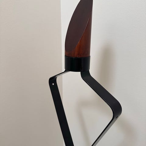 VINTAGE IKEA 🤩 Designet af Tord Björklund for IKEA 🥰 stumtjener i metal i cremefarvet nuance. Fritstående model med sorte plastender til ophæng af jakker, frakker, tasker og tilbehør. Stabil fod med buede ben og sorte plastfødder, der beskytter gulvet. Velegnet til entré, gang eller kontor til organisering af overtøj.
