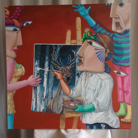 Farverigt figurativt maleri med karikerede personer i stueinteriør. Maleriet har et humoristisk og ekspressivt udtryk med tydelige konturer og mange detaljer.