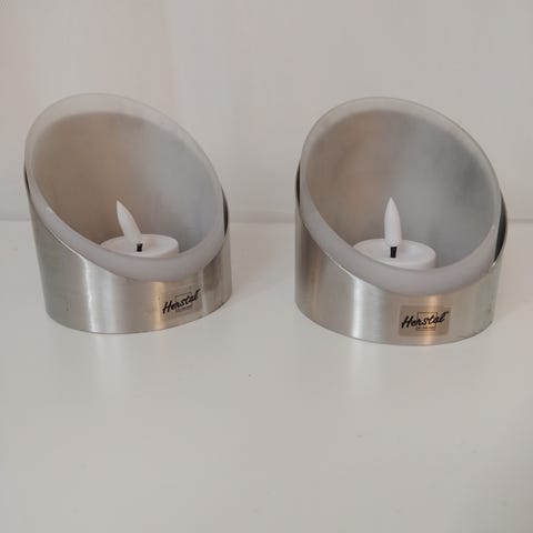Herstal lysestager i metal med glasindsats. Lysestagerne består af en høj, buet metalbase med en lille glasskål øverst til fyrfadslys eller små stearinlys. Designet er enkelt og moderne . Velegnet som dekoration enkeltvis eller som sæt.