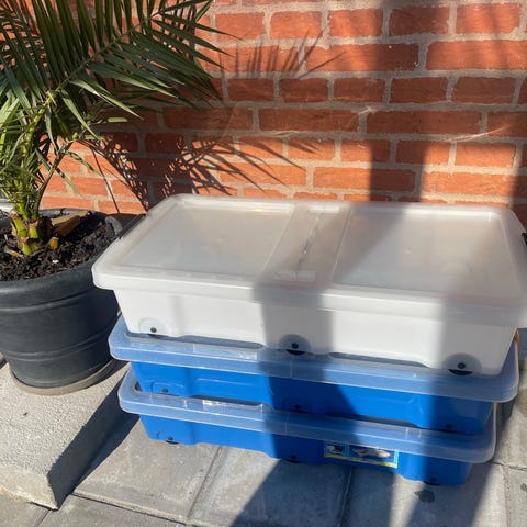 en bedroller og to opbevaringskasser uden hjul