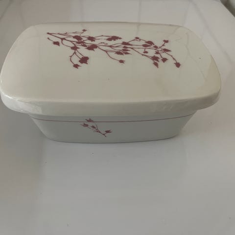 Denne smørboks er en del af stentøjsstellet "Siesta" produceret af Bing & Grøndahl i samarbejde med Kronjyden/Nissen
