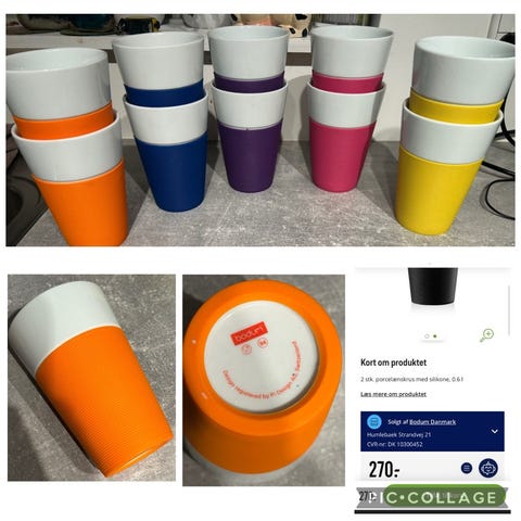 Bodum termokrus i hvidt porcelæn med rødt silikonebånd omkring midten. Krusene er designet til varme drikke, hvor silikonebåndet giver et bedre greb og beskytter hånden mod varme.