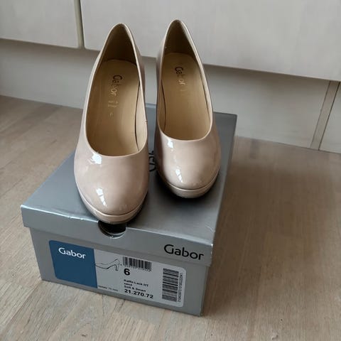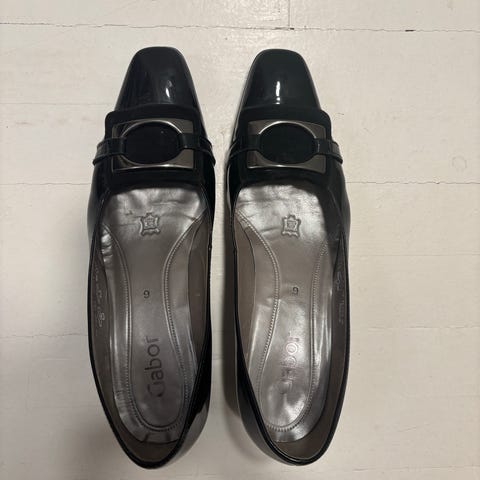 Gabor højhælede sko i størrelse 39. Klassiske pumps i sort laklook med lukket tå og hæl. Skoene har en mellem-høj hæl og en afrundet snude. Velegnet til brug ved formelle anledninger, arbejde eller hverdag, hvor der ønskes et enkelt og klassisk udtryk.