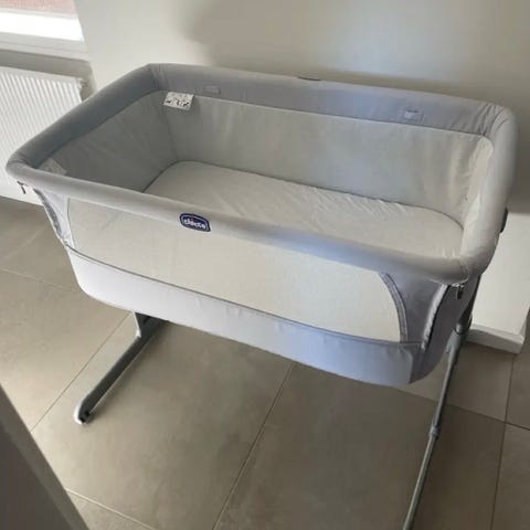 Chicco bedside crib i grå. Sengen har metalstel og bløde tekstilsider, heraf en side med net, som giver udsyn og ventilation. Madrassen er rektangulær og passer til sengen. Velegnet som babyseng ved siden af forældresengen.