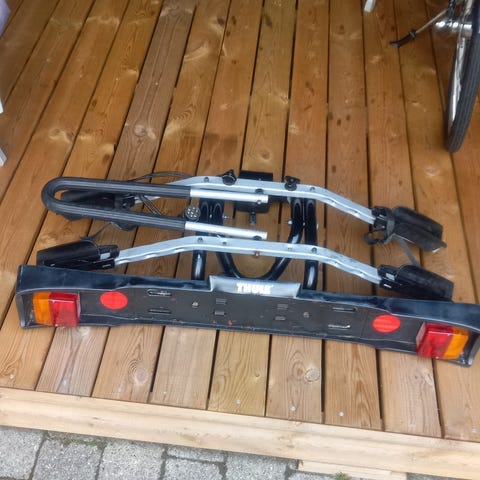 Thule cykelholder til montering på bil. Cykelholderen har plads til flere cykler og er udstyret med justerbare holdere og remme til fastgørelse af cyklernes stel. Konstruktionen er i metal med plastbeslag ved kontaktpunkterne til cyklerne. Egnet til transport af cykler på bil, for eksempel til hverdag eller fritidsbrug.