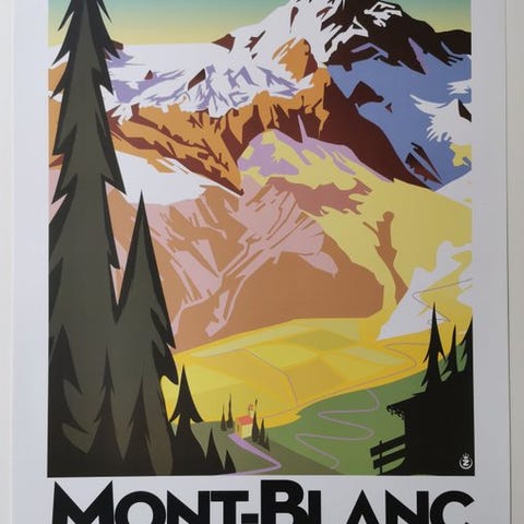 Original plakat udført af Richard Zielenkiewicz, kendt under pseudonymet Monsieur Z i samarbejde med byen Chamonix for at promovere turismen omkring Mont-Blanc.