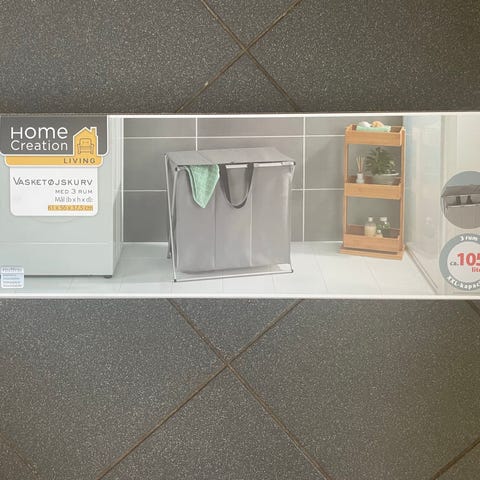 Vasketøjssorterer med 3 rum i hvidt stof og sort metalstativ. Hver pose har håndtag, som gør det nemt at tage vasketøjet op og bære det til vaskemaskinen. Egnet til sortering af tøj i f.eks. lyst, mørkt og kulørt. Kan bruges i bryggers, badeværelse eller garderobe til organisering af vasketøj.