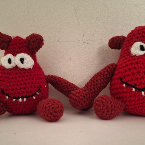 Hæklet bamse sæt i blå med mørkeblå detaljer. Figurerne har broderede øjne og mund samt små vinger i siden. Velegnet som blødt legetøj eller pynt på børneværelset. Materialet fremstår som blødt garn, fyldt med vat for at give form og volumen.