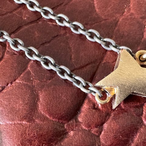 Den brune kæde er 120 cm. Også mærket OL.