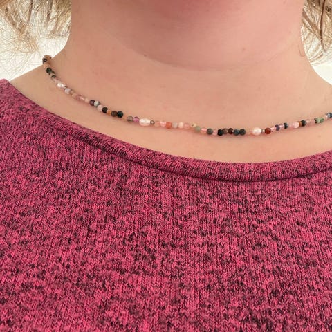 Emely halskæde i s925 sølv med smukke ferskvandsperler og farvede halvædelsten. Længde: 38 cm. + 5 cm. forlænger. Halskæden er brugt få gange, ingen brugsspor.