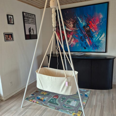 Sælger denne vugge fra Membantu med motor, loftophæng og vugge med fast bund.