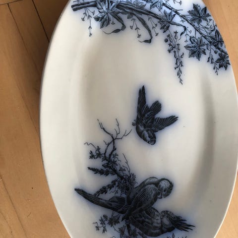 Serveringsfad i porcelæn i hvid med blå blomsterdekoration. Ovalt fad med let bølget kant, egnet til servering af fx kød, fisk, grøntsager eller andre retter ved borddækning. Passer til klassisk og traditionel stelstil.