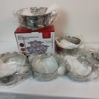 10 dele Royal Swiss grydesæt i rustfrit stål. Bestående af 2,5 l. gryde med låg, 3,4 l. gryde med låg, 4,5 l. gryde med låg, 5,8 l. gryde med låg og 7,4 l. gryde med låg. Virker også til induktion. Ubrugt og i original emballage
