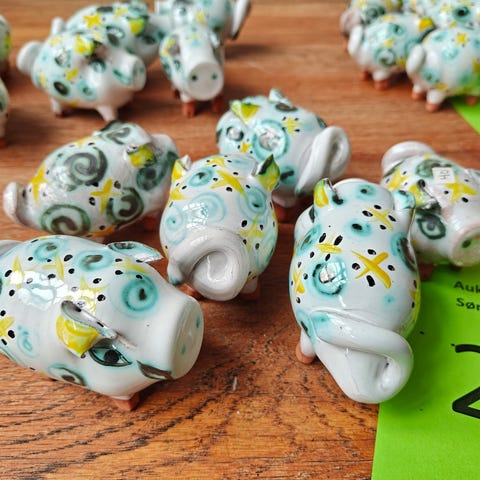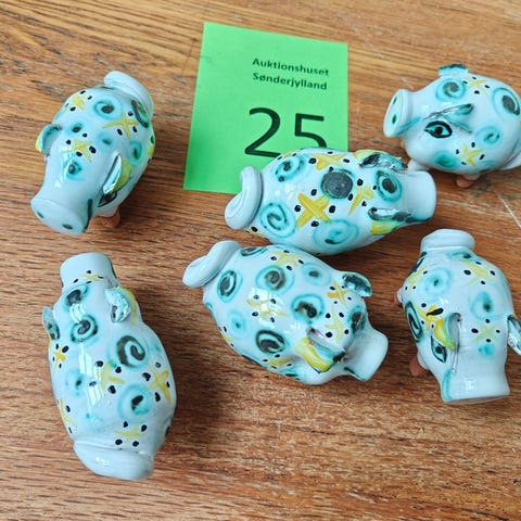 Små grise af keramik L. ca. 10 cm. Effekterne stammer alle fra Boet efter Kunstner Marianne Permin. Keramik af kunstneren selv er 2. sort. Derfor kan der forekomme fejl eller mangler.