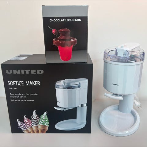 Softice maskine. Model SIM1300, 1,0 liter kapacitet. Softice på 20-30 minutter. Fra United. Nypris ca. 350kr. Ubrugt og i original emballage. 5 pakker á 5 stk plast opbevaringsbokse. 160ml, 300ml, 550ml, 1000ml og 1500ml. Godkendt til mikroovn, opvaskemaskine, frost og naturligvis fødevarer. Nypris 49,95kr pr pk. Ubrugte fra dansk grossist