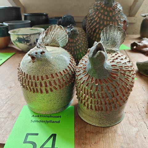 Marianne Permin. 2 fugle af keramik. H. ca. 23 cm. Effekterne stammer alle fra Boet efter Kunstner Marianne Permin. Keramik af kunstneren selv er 2. sort. Derfor kan der forekomme fejl eller mangler.