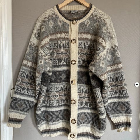 Vintage uldtrøje fra italienske Rifle med klassisk mønster. Den er i rigtig god stand uden fejl eller huller. Bredden ved armhulerne er ca. 46 cm og længden ca. 63 cm.