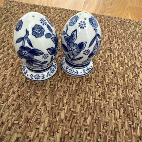Emalje saltbøtte og spand i blå farve. Saltbøtten har trælåg og vægophæng samt tydelig tekst "SALT" på fronten. Spanden har hank og låg i samme blå emalje. Begge dele er velegnede som køkkenbeholdere eller dekorative elementer i indretningen. Eventuelle mærker og stempler fremgår af billederne.