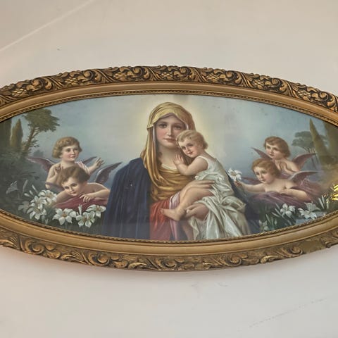 Ovalt billede med motiv af dansende børn i naturen ved en sø og med træer og bakker i baggrunden. Motivet viser flere børn i lette klæder, der danser i en rundkreds på en græsplæne, samt en voksen skikkelse med krans og bånd. Billedet er malet på plade og har en beskrivelse og ældre mærkater på bagsiden.