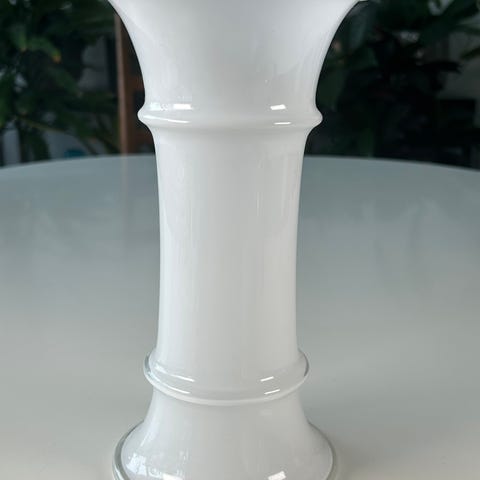 Vaserne er udført i karakteristisk opaline glas – en teknik hvor farvet glas kombineres med en hvid inderside, hvilket giver den dybe, næsten glødende farve og den elegante hvide kant. Denne type glas blev særligt populær i dansk design i 60/70’erne og er stadig efterspurgt i dag .