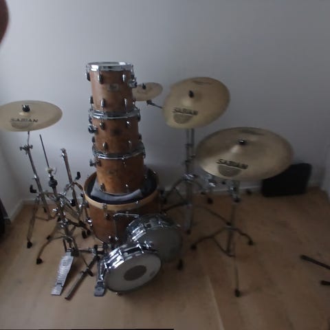 Desværre har tidligere ejer spillet uden frontskind på stortromme som nogen gjorde... og derfor mangler den oprindelige reife. Dog er der fundet tilsvarende Pearl reife med et brunligt folie inlay. En engelsk tomholder er fjernet, og det org. Pearl system er fundet og monteret istedet.... som det skal være.