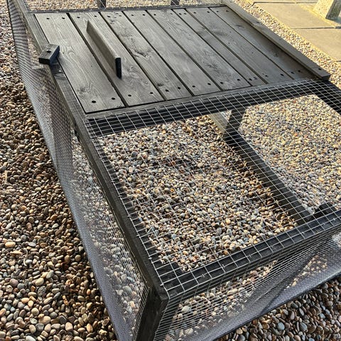 Fin sammenklappelig løbegård. Har en del bidemærker, men ikke noget der er til gene for funktionen. Lågen er stribset fast.