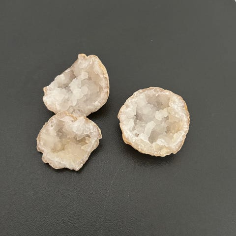 Krystalgeode. Stenen er i to halvdele, som hver viser indvendige krystaller i klar til hvidlig farve. Ydersiden fremstår som rå natursten.