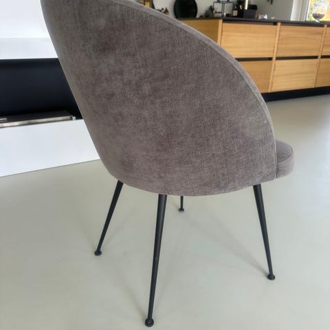 4 stk. Vern spisebordsstole i farven Dark Grey (velour). Den ene stol har 2 cm, højere ben end de andre.
