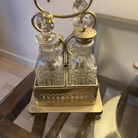 Krydderisæt bestående af to glasflasker og to mindre glasbeholdere med skruelåg, samlet i en oval holder i metal/stål med bærehank. Sættet er egnet til fx olie, eddike, salt og peber eller andre flydende og tørre krydderier. Holderen har udskårne pladser til hver beholder, så de står stabilt under brug og transport på bordet.