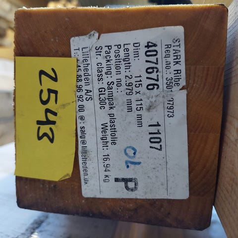 Limtræsbjælke/stolpe 2625x115x115 mm 4-lags bjælke fra Lilleheden A/S. Bjælken er pakket/wrapped i plast, lidt lagerstøv. Med gevind i den ene ende og stolpefod i modsatte ende. Mål:L2625xB115xH115mm.