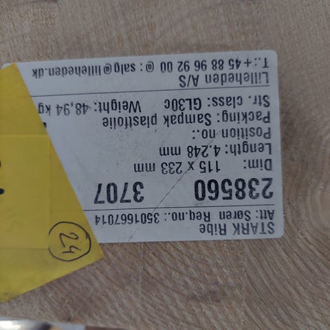 Limtræsbjælke 3549x115x166 mm. 5-lags bjælke fra Lilleheden A/S. Bjælken er pakket/wrapped i plast, lidt lagerstøv. Har skruebeslag/gevind i den ene ende. Mål: L3549xB115xH166 mm.