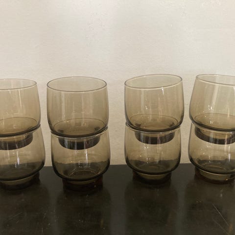 4 ældre røde Bøhmiske drinksglas (eller ølglas / vandglas) med hvide slibninger - måske af ananas eller druer. Glassene er 15,5 cm høje og og har en diameter på 6,5 cm og sælges samlet for 150 kr., som betales kontant eller MobilePay ved afhentning fra adresse.