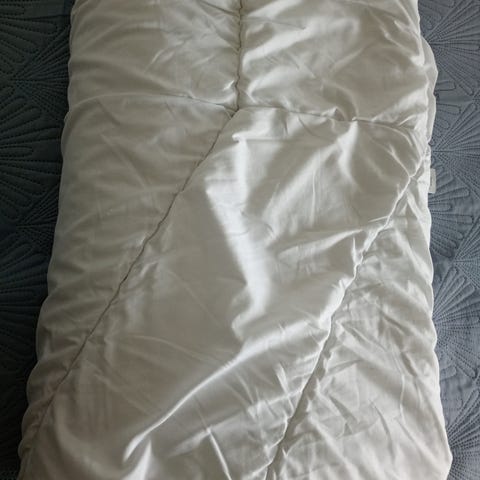 Jysk dyne i hvid farve. Dynen har kvadratisk quiltning, som holder fyldet jævnt fordelt. Yderstoffet fremstår i lys, neutral tone. Ifølge mærkningen er dynen certificeret efter Oeko-Tex Standard 100. Velegnet til brug i soveværelse som almindelig enkeltdyne. Yderligere oplysninger om mål, fyldtype og varmegrad kan aflæses på det