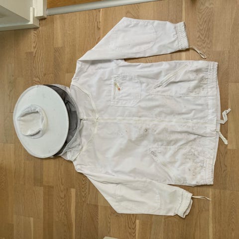 Biavler heldragt i hvid farve. Dragten har lange ærmer og lange ben samt lynlås foran. Der er fast hætte med net, som kan lukkes foran ved halsen. Egnet til brug ved biavl som beskyttelsesbeklædning.