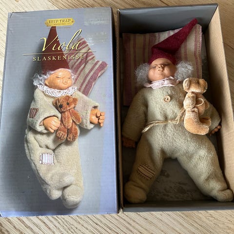 Trip Trap slaskenisse PELLE , til brug som dekoration i juletiden. Nissen er udført som en lille dukke med rødt nissehue, ternede bukser og strikket trøje samt tilbehør i form af sæk. Egnet til indendørs juleudsmykning, f.eks. på hylde, bord eller i vindueskarm.