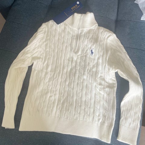 Ralph Lauren Polo herretrøje i størrelse S. Strikken er fremstillet i bomuld og har et kabelstrikket mønster. Farven er blå, og trøjen har høj hals med lynlås samt ribkanter ved hals, ærmer og bund. Velegnet som varm lag-på-lag over en T-shirt eller skjorte.